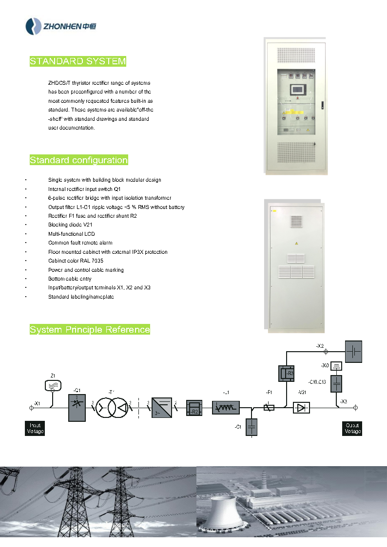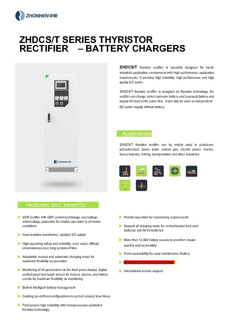 ZHDCS/T系列晶闸管整流电源系统是壹号娱乐 对海外电网系统的可靠性进行了分析,基于多年的研发和设备运行经验,采用可控硅作为整流器件的供电系统,其原理是交流输入电压经工频变压器降压,再由可控硅整流,输出稳定可靠的直流电。充电器采用AC-DC转换器对电池进行平滑电压充电。